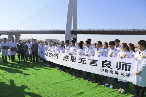 2017年4月1 日上午,在永宁浮桥边,学校学生处、遗体捐献办公室、临床医学院以及6号学生公寓党支部共同举行了以“送无言良师,回归母亲河”为主题的遗体捐献者告别活动。深深地表达了对“无言良师”为医学事业做出贡献的感激之情以及对“无言良师”的缅怀与哀思。