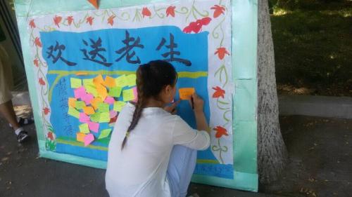 青春梦前行,回味母校情。6月15日,为了给毕业生们留下值得回味的毕业季,高职学院学生会组织学生在校门口给来往的毕业生送他们自己制做的花,表达了他们对学姐、学长的祝福,希望他们的前程像花儿一样绽和绚烂。同学们设计了一面祝福展板,在上面写出了对学长和学姐的祝福。同时,老生也在上面留下对学校对学妹学弟的良好祝愿。欢送老生的活动在一片温馨的氛围中圆满结束。