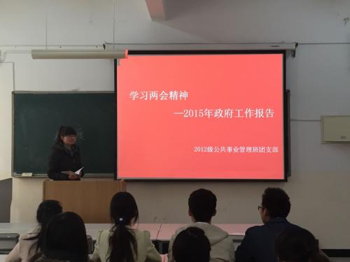 首先辅导员简单介绍了政府工作报告要点及“两会“期间的热点议题,并用最贴近生活的一些事例向学生们普及了两会常识及知识,动员全体学生关注此次两会内容,了解相关的政策方针。随后各班团支部相继开展了学习“两会”精神座谈会,结合此次热点议题和今后同学们的学习生活进行了讨论和交流。在会上,同学们各抒己见,各班同学通过人员分组,在热烈的讨论之后派出代表进行了交流发言。交流中,潘闯同学说到:“2015年是全面深化改革的关键之年,是全面推进依法治国的开局之年,对于我们来说,在学习工作中就要做到头脑灵活,学会变通,深刻自省,严格要求自己遵守纪律,要以勤奋努力的姿态投身到日后的学习中。日常的学习生活中,我们一定要有创新精神,积极参加各项文化活动.......”。王玉玺同学说到:“‘两会’在环境中提到‘铁腕治理’,这就说明我国目前环境污染很严重,已经是民生之患。因此,我们作为大学生就要以身作则,示范他人,从自我做起,每天都要保持教室、宿舍、校园、公共场所的清洁,不能愧对于我们所受的高等教育。”邹佳琦同学说到:“加强重特大疾病医疗救助,全面实施临时救助制度,让遇到急难特困的群众求助有门、受助及时,这将帮助更多的困难家庭就医。”连建明、韩瑞娟、罗朝丽等四位同学也纷纷代表自己小组就依法治国、权力瘦身、发展目标等方面进行交流发言。交流会后最后,辅导员也做了会议总结,鼓舞同学们了解和学习“两会“精神,增强自信心,努力突破自我,更加认真踏实的投身在今后学习生活中。