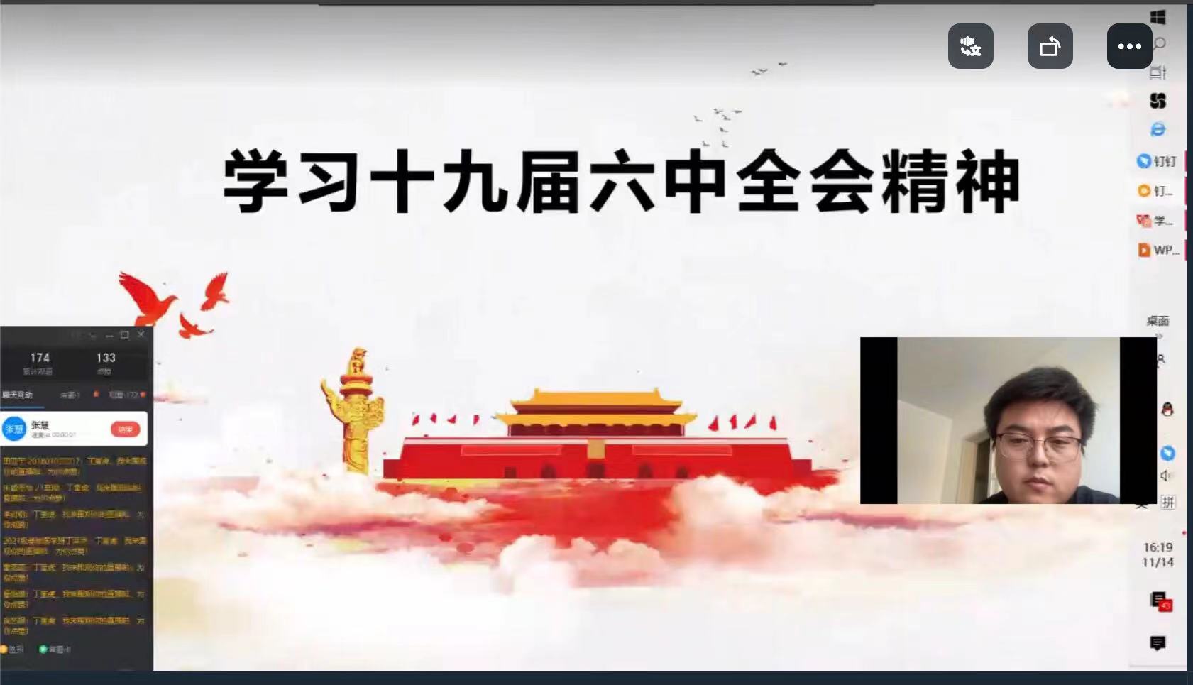 线上会议中,辅导员张慧带领全体本科生学习了十九届六中全会的概况和十九届六中全会公报的主要内容。重点学习了党的百年奋斗重大成就和历史经验和一百年来,党领导人民进行伟大奋斗,积累了宝贵的历史经验。这些宝贵的经验是我们党弥足珍贵的精神财富,更是我们党引领中国未来的科学指引。与会的两名学生发表了心得体会。