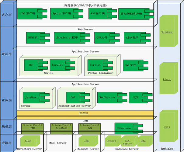 数据的存储与管理可以使用文件系统、消息中间件(支持JMS)、目录服务器和关系数据库管理系统(支持Oracle、SQL Server等)。