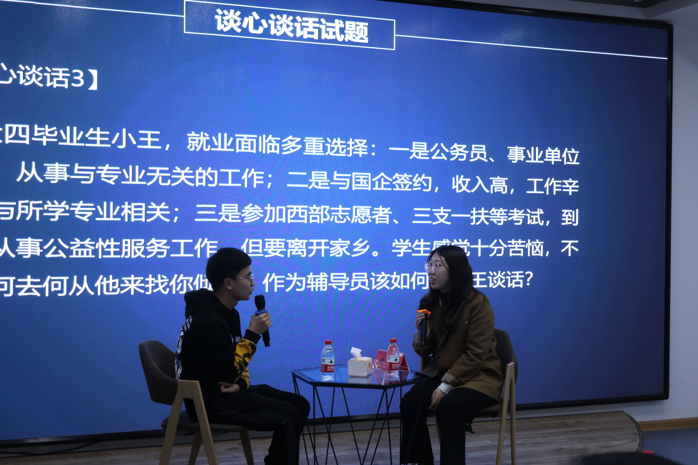 本次比赛以谈心谈话的形式开展,共有19位专职辅导员参赛。比赛中,参赛辅导员随机抽题,与学生将谈心谈话案例情景再现,通过判断谈话学生的心理活动状况,抓住问题要点,充分展现了其沟通技巧及解决日常学生教育管理过程中实际问题的能力。