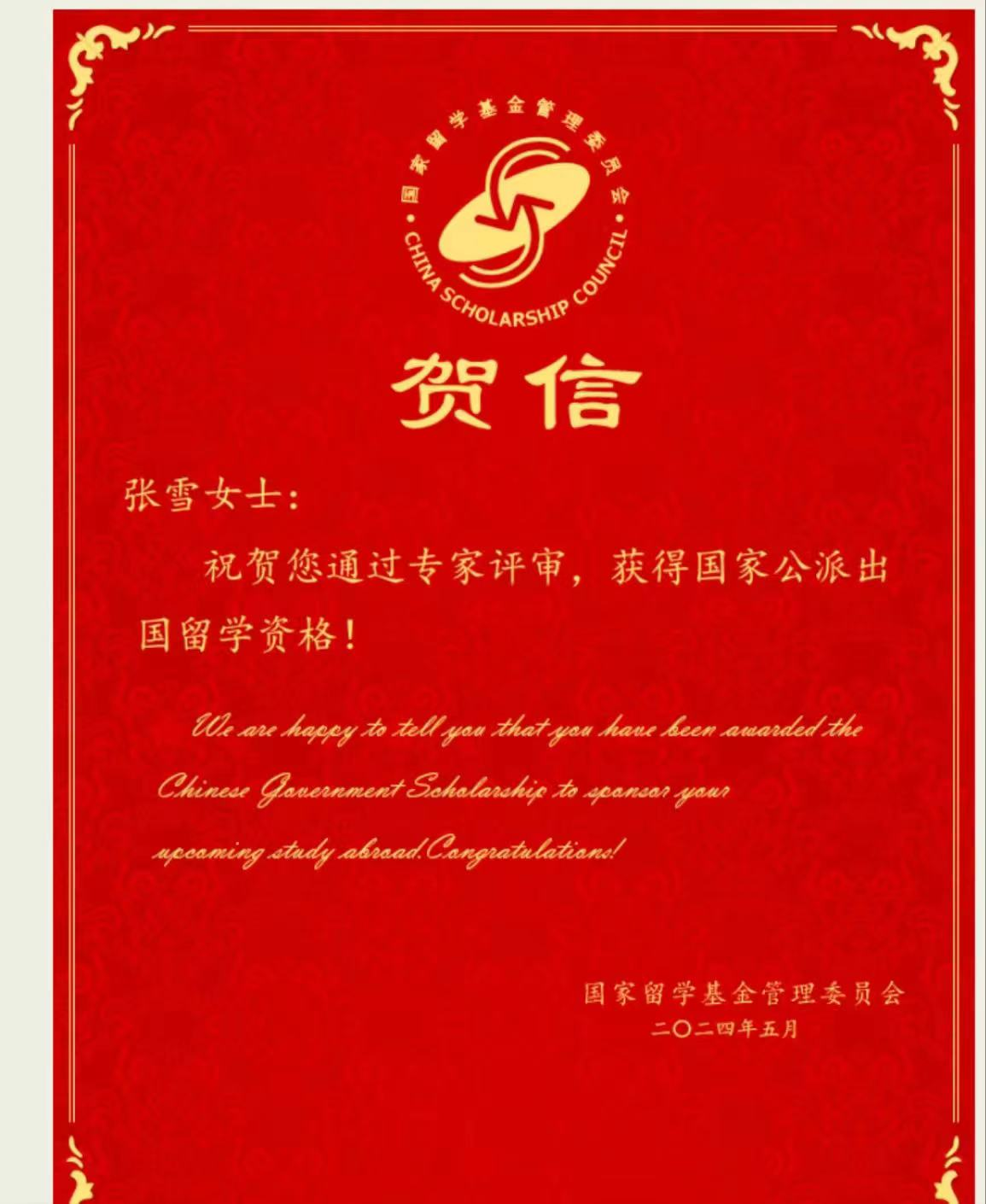 2021级公共卫生学院硕士研究生张雪,通过国家留学基金管理委员会评审,喜获国家建设高水平大学公派研究生项目奖学金,成功申请比利时荷语鲁汶大学攻读博士学位研究生。