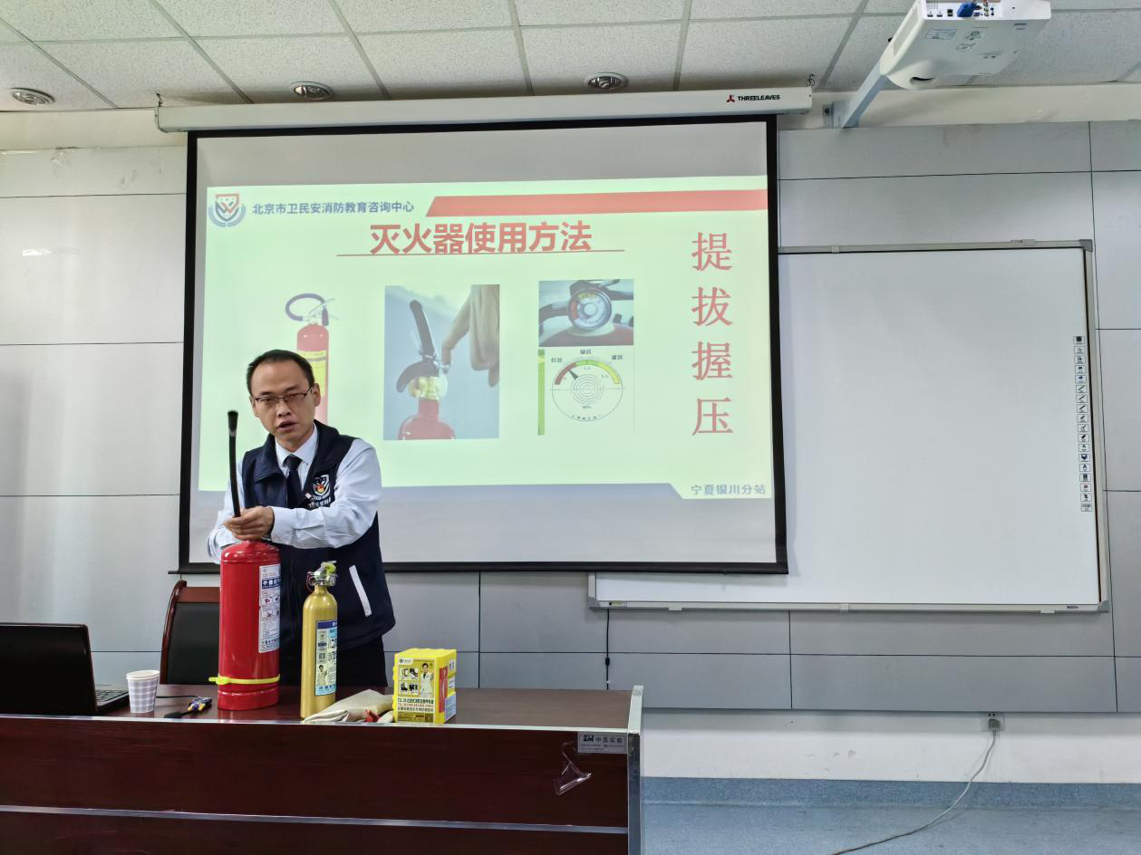 讲座结束后,保卫处杨俊康讲解了灭火器材的使用方法,并组织师生进行灭火操作演练,切实做到学以致用。