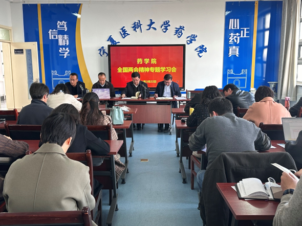 3月22日上午,药学院召开全国两会精神专题学习会,学院全体教职工参加,学院党委书记汤波主持会议。