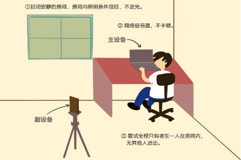 复试应选择封闭安静的房间。房间内照明条件良好,不逆光;网络信号强,不卡顿;无定时闹钟等设备,免干扰。复试全程只有考生一人在房间内,无其他人进出。