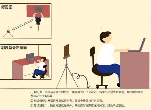 1.网络远程复试实行双机位,一台主设备用于正面拍摄,一台辅助设备用于侧后方监控拍摄。