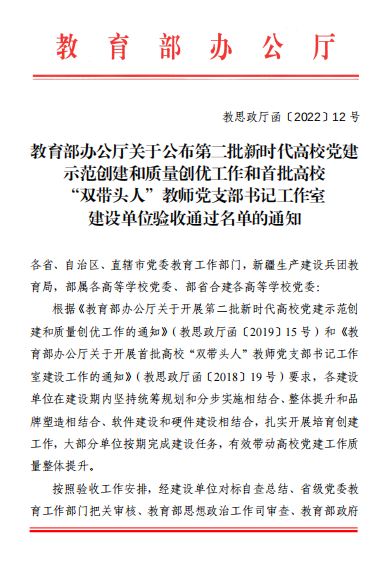 2022年6月7日,教育部办公厅发文,药学院党委通过第二批“全国党建工作标杆院系”培育创建验收。