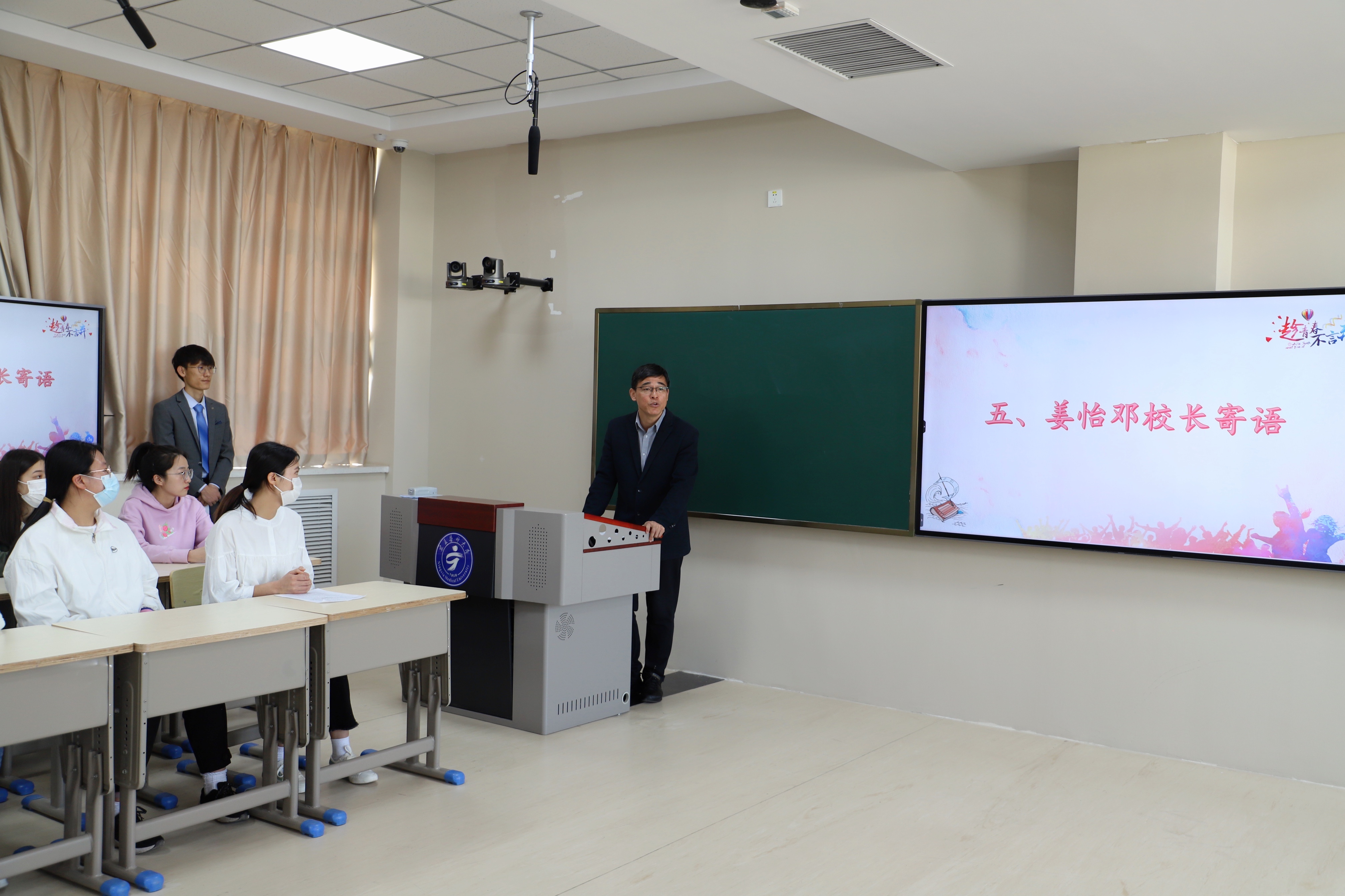 姜怡邓寄语同学们,第一,要与时代同行。将个人的发展紧密地与国家和民族发展结合起来,听党话、跟党走,做一名具有家国情怀,德智体美劳全面发展的新时代新青年。第二,要正确自我定位。每个人都是社会的一份子,要努力适应社会发展,找准奋斗目标,学会辩证思考,用自己所学回报社会和国家。第三,要有“敢为天下先”的勇气。要敢想、敢做、敢为,培养宽阔胸怀,勇于拼搏创新,解放思想,不怕失败,努力成长为合格药学人才。