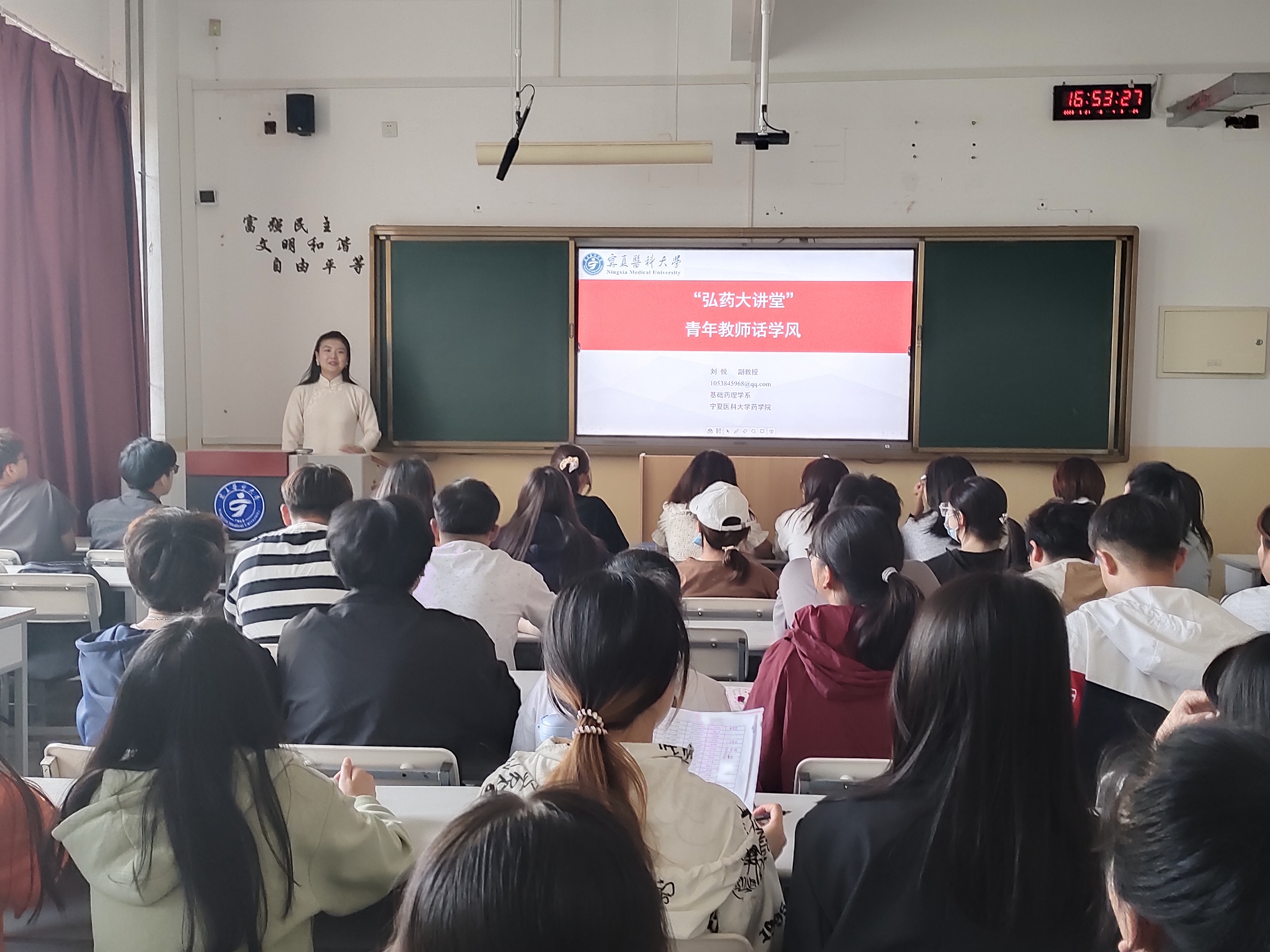5月21日,药学院2023年弘药大讲堂“青年教师话学风”第五期专题讲座谦教学楼开讲,学院优秀青年博士刘悦老师讲授,2021级、2022级60余名同学参加